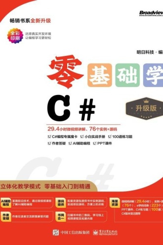 - 零基础学C#(升级版)从初学者角度出发,通过通俗易懂的语言、有趣的实例,详细介绍了使用C#进行程序开发需要掌握的知识和技术。全书共分16章,包括“宇宙第一”IDE——Visual Studio、踏上C#开发的征程、必须学会的C#语法、流程控制语句、数组——批量数据处理、看似简单的字符串、面向对象程序设计、Windows交互式图形界面、Windows控件——C/S程序的基础等。书中的知识结合具体实例进行讲解,设计的程序代码在需要的地方也给出了详细的注释,可以使读者轻松领会C#程序开发的精髓,快速提高开发技能。 《零基础学C#(升级版)》通过大量实例和一个完整的项目案例,帮助读者更好地巩固所学知识,提升能力;随书附赠的《小白实战手册》中给出了3个实用案例的详细开发流程,力求让学习者能学以致用,真正获得开发经验;附赠的资源包中给出视频讲解、实例及项目源码、PPT课件等,方便读者学习;书中设置了200多个二维码,用手机扫描二维码观看视频讲解,可以解决学习疑难。 明日科技是一家专业从事软件开发、教育培训以及软件开发教育资源整合的高科技公司。其编写的教程既注重选取软件开发中的必需、常用内容,又注重内容的易学易用以及相关知识的拓展,深受读者喜爱。同时,其编写的教程多次荣获"全行业优秀畅销品种”"中国大学出版社图书奖优秀畅销书”等奖项,多个品种长期位居同类图书销售排行榜的前列。
